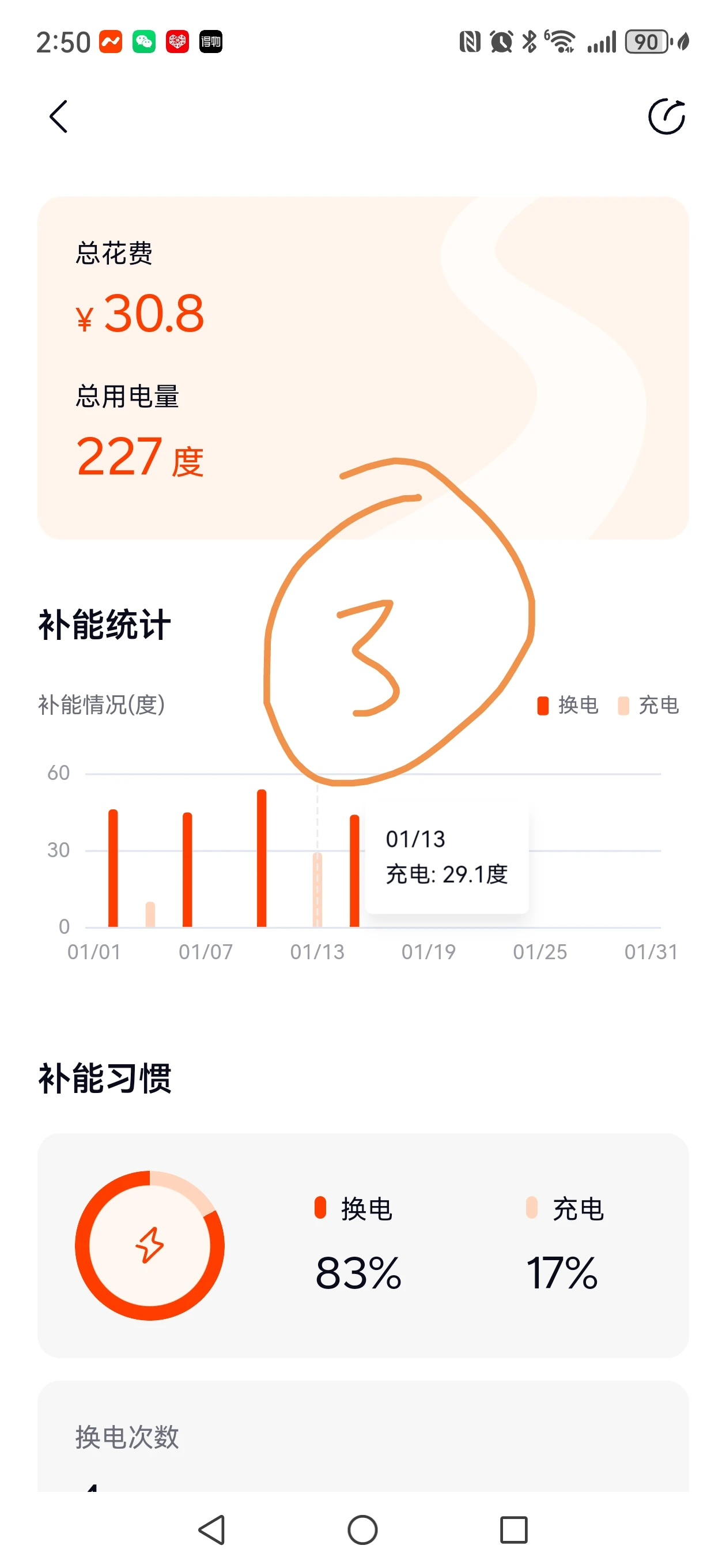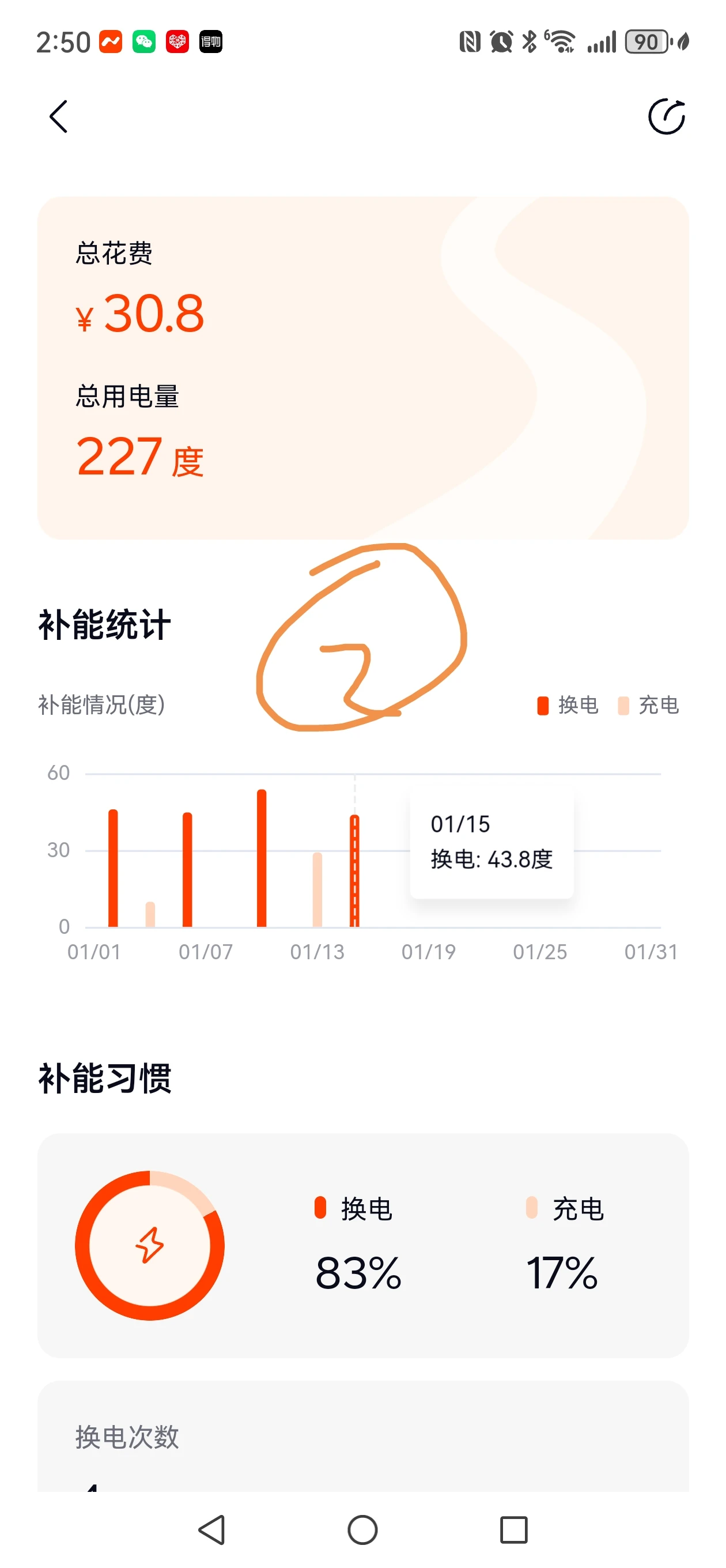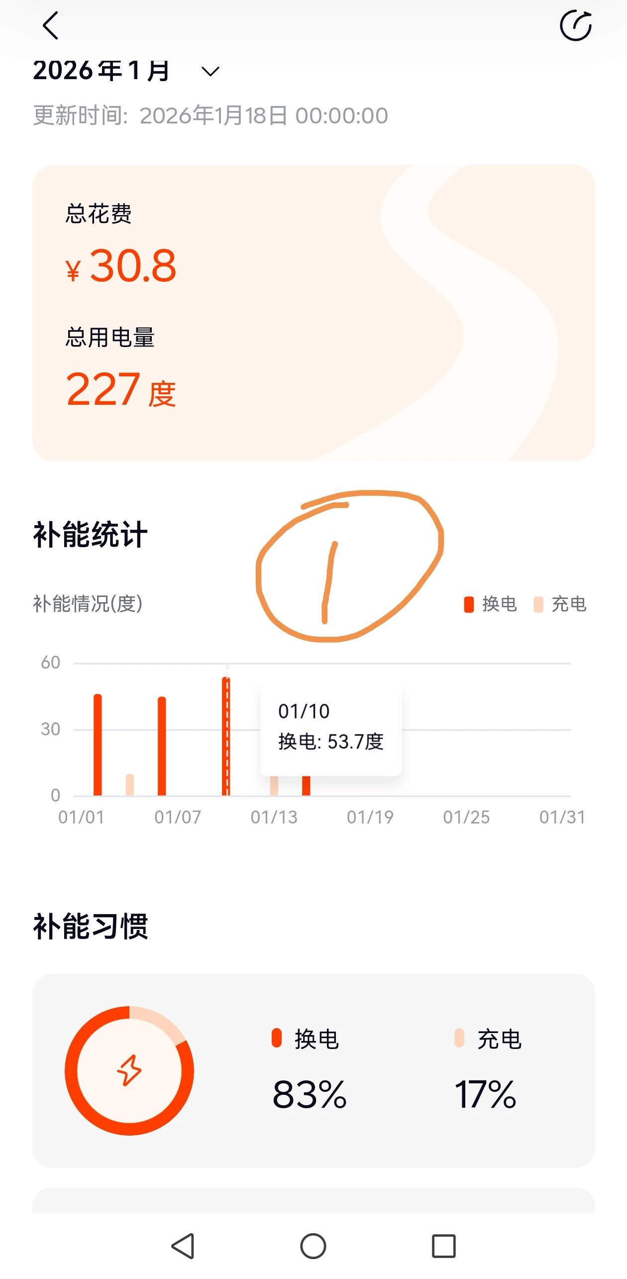 乐道L90,每日通勤大概85KM,一周总花费如下:1月10剩余13%电量第一次换电53.7度;1月13日充电29.1度;1月15日换电43.8度,截止到1月18日剩余电量65%(60度电池*0.45=27度);
