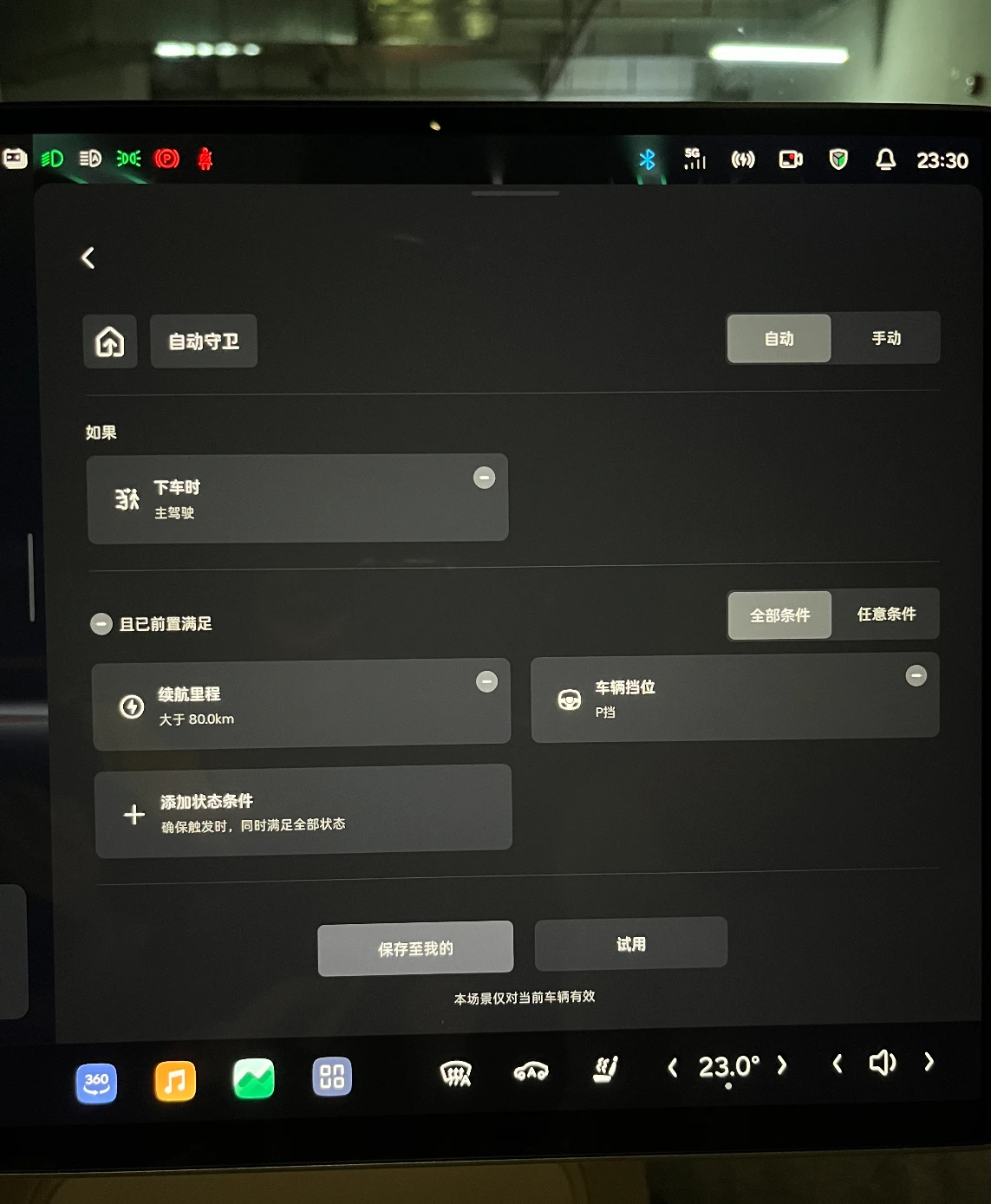 挂倒挡自动关闭车外低速提示音。地库里倒车,低速提示音的回声特别吵。有一次在地库倒车,回声吵得我头疼。后来设了这个口令,挂倒挡世界安静,倒完车自动恢复。现在每次倒车,心里都默默感谢这个口令。