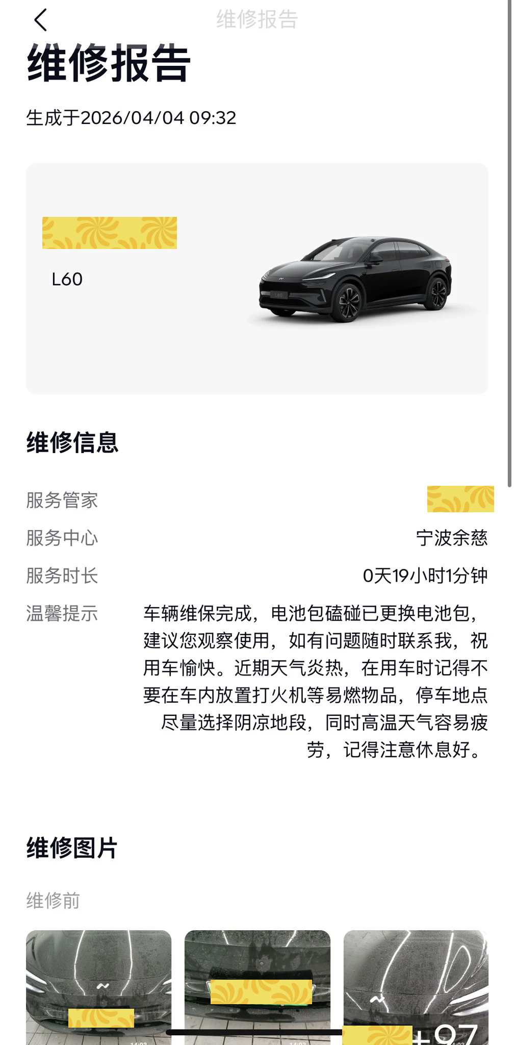 上班路上不小心碾过一块石头,当时砰的一下,心里不放心,下午把车开去4s店检查,一检查,电池被磕出了几个坑,售后说电池要报废了,但是他们会处理好,也不需要我报保险,让我回去等消息就好,本来还以为要等好久,因为身边朋友的电车也发生过类似的情况,结果第二天售后电话过来说可以拿车了。